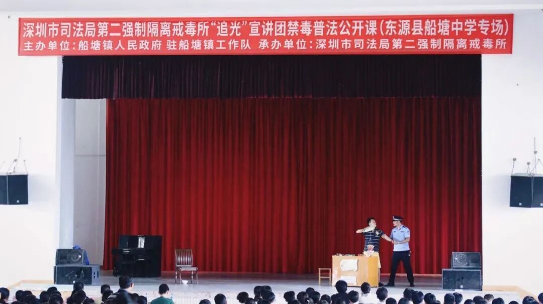 为增强青少年禁毒意志,提拔乡村塾生识毒、防毒、拒毒才调,近日,由河源市东源县船塘镇东说念主民政府专揽、深圳市法则局第二强制毁坏戒毒所经办的“追光”宣讲团禁毒普法公开课在河源市东源县船塘中学开讲。