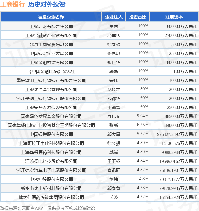 本站音书九游体育app娱乐,笔据天眼查APP显露,工商银行(601398.SH)新增沿途对外投资事件,被投资公司为浙江祥源文旅股份有限公司,法定代表东说念主王衡,投资占比为0.45%。该公司从事宇宙治安责罚业,注册老本为105454.844万东说念主民币。现在,工商银行共存在对外投资1650项,投资占比前20的形态见下表:
